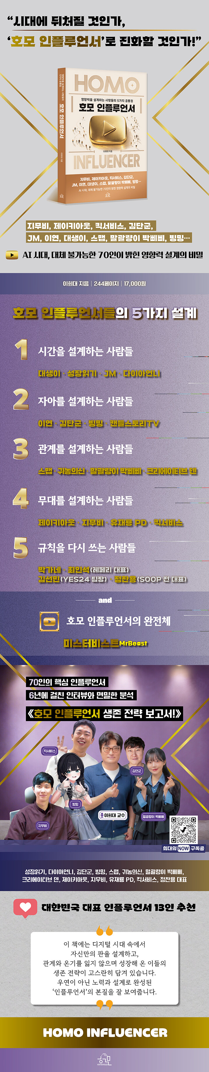 지무비, 제이키아웃, 킥서비스, 김단군, JM 등 각 분야에서 두각을 드러낸 국내 인플루언서들의 사례와 ‘호모 인플루언서’의 가장 완성형에 가까운 사례인 미스터비스트(MrBeast)의 성공 전략을 이 다섯 가지 핵심 축으로 정리했다. 이를 통해 영향력이 만들어지는 구조를 입체적으로 이해하도록 한다.
