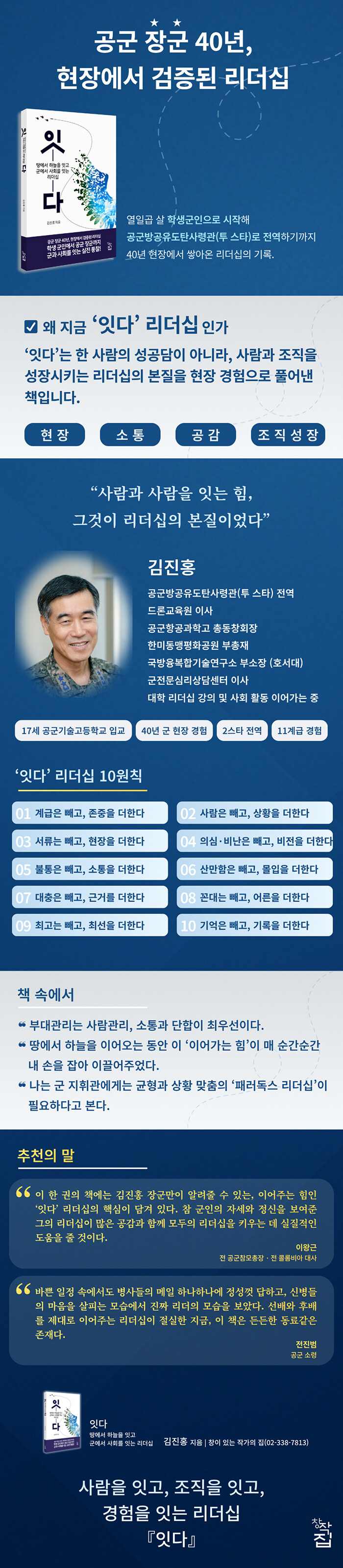 저자 김진홍은 열일곱 살에 공군기술고등학교(현 공군항공과학고등학교)에 입교하며 공군 생활을 시작했다. 이후 공군방공유도탄사령관(투 스타)으로 전역하기까지 약 40여년 동안 군 현장을 누볐다. 단기간 운영되었던 2사관학교 출신이라는 제약 속에서도 그는 열정적인 군생활을 통해 최고 지휘관의 자리까지 올랐다. 그 원동력은 언제, 어디서나 자신이 할 수 있는 최선을 다하며, 소통과 공감을 통해 조직을 성장시키려는 태도였다. 이 책은 그 군 현장에서 쌓아온 경험과 박사과정에서 축적한 연구 자료를 바탕으로 정리한 리더십의 기록이다.
