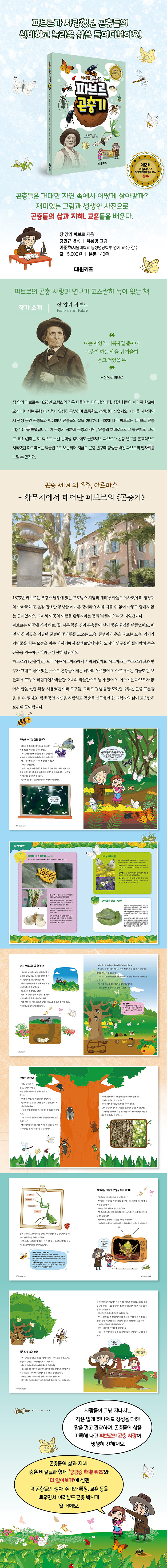 머리글 004 / 차례 006 / 01 똥은 보물이야 쇠똥구리 들판의 작은 청소부 018 /고집쟁이 도전자 020 / 얌체 쇠똥구리 022 / 알을 위한 특별한 집 024 / 애벌레의 놀라운 집수리 기술 027 / 자연의 숨겨진 멋진 일꾼 029 / 궁금증 해결 퀴즈 031/ 더 알아보기 032/ 02 봄소식을 알리는 배추흰나비 나비일까? 나방일까? 036 / 나비의 특별하고 놀라운 능력 040 / 알껍데기는 영양분 덩어리야 044 / 먹고 또 먹고 부쩍부쩍 자랄 거야 046 / 번데기의 위장술 048 / 자연의 이치는 정말 신비해 050 / 궁금증 해결 퀴즈 053 / 더 알아보기 054 / 03 마비의 명수 나나니벌 나나니벌과 애벌레 058 / 집짓기의 명수 061 / 애벌레의 탄생 064 / 나나니 이야기 066 / 나만의 집을 짓다 069 / 첫 사냥! 그리고 수술 070 / 개미 도둑과의 싸움 071 / 다시 사냥, 그리고 알 낳기 072 / 아름다운 세상 074 / 궁금증 해결 퀴즈 075 / 더 알아보기 076 / 04 여름날의 노래꾼 매미 여름이 왔어요! 080 / 맴맴, 지글지글, 쐐얘 쐐얘~ 083 / 매미가 게으름뱅이라고? 084 / 나무의 즙은 너무 달콤해 085 / 개미에게도 먹이를 나눠 줘 087 / 아기 매미는 어디서 살까? 088 / 매미는 오줌싸개 089 / 드디어 땅 위로 나오다 091 / 4년을 기다렸다가 부르는 노래 094 /궁금증 해결 퀴즈 099 / 더 알아보기 100 / 05 기도하는 벌레 항라사마귀 나는 기도하는 벌레야 104 / 낫과 가시는 내 비밀 무기 107/ 사마귀는 대식가, 쯔양은 저리 가라야 109 / 내 몸 바쳐 가족이 행복해질 수 있다면 114 / 난낭은 최고의 요새 115 / 궁금증 해결 퀴즈 119/ 더 알아보기 120 / 06 숲속의 왕자님 떡갈나무하늘소 죽은 나무 속의 비밀 124 / 애벌레는 나무를 갉아 먹는 곤충 126 / 기어다니는 소화기 128 / 나무는 애벌레의 집이자 식량 129 / 탈출 터널을 파 둬야 해 131 / 돌벽으로 안전하게 133 / 똑똑한 생존 전문가 135 / 궁금증 해결 퀴즈 137 / 더 알아보기 138 / 궁금증 해결 퀴즈 정답 140