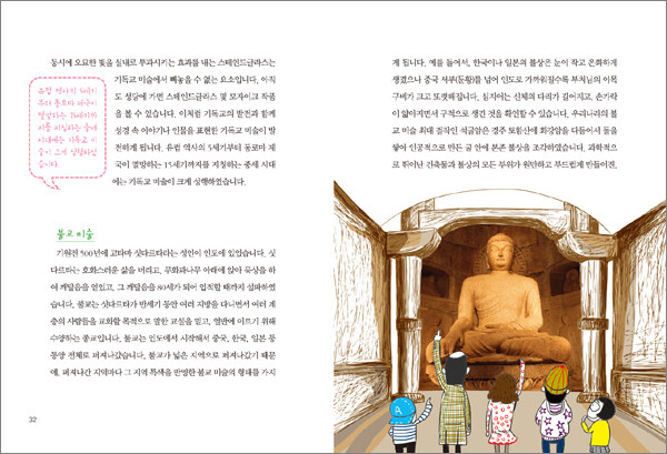 석굴암은 바위산 전체를 그대로 조각해서 동굴 내부에 만든 불상이지요? 고흐는 자기 귀를 자른 천재 화가로 유명하고요? 마르쉘 뒤샹의 ‘샘’(50P)은 기성 제품에 의미와 메시지를 부여해 미술품으로 승화시킨 기념비적인 작품입니다. 하필이면 ‘남성 변기’로 말이죠. 이러한 작품들에 더해진 삽화를 찬찬히 잘 살펴보세요. 작품을 만들 때, 작가의 고뇌, 또는 아이디어, 또는 그 작품이 갖는 메시지나 영향력까지 아주 재미있는 구성으로 꾸며, 미술품 원화를 보는 재미에 한 번 더 재미를 느낄 수 있답니다.
