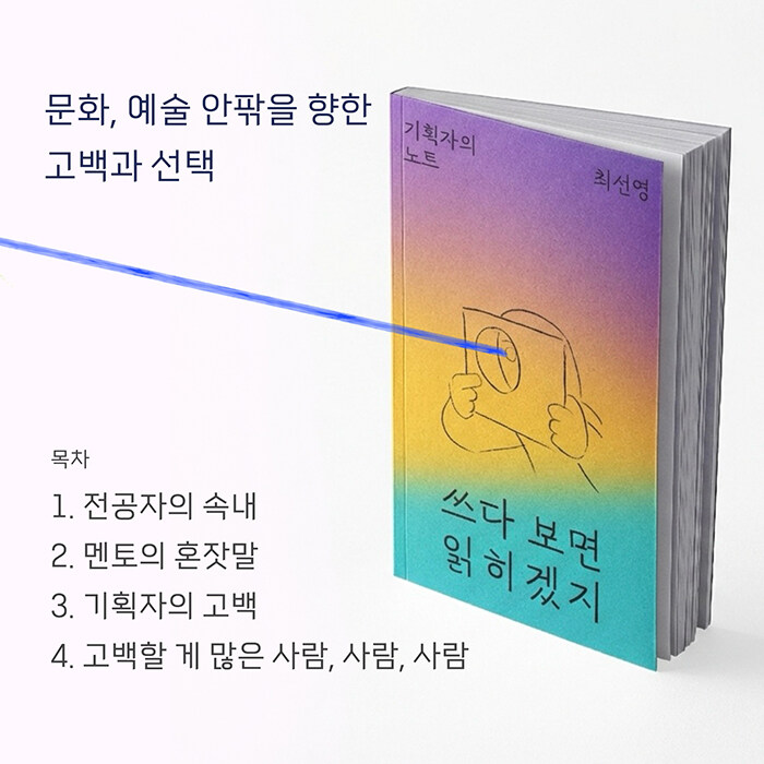 개인 홈페이지에 ‘쓰다 보면 읽히겠지’라는 제목으로 시작된 글들이 타인에게 읽히기 시작하며, 쓰기와 읽기의 관계를 탐색하는 기록이다. 떠오르는 질문과 생각을 글로 옮기고 그것이 누군가에게 닿기를 바라는 과정 속에서, 글쓰기가 또 다른 사건으로 확장되는 경험을 담는다.