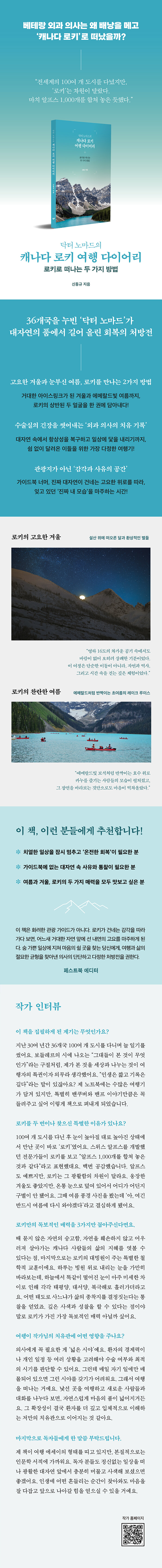 베스트셀러 『군의관, 태평양을 건너다』의 저자이자 33년간 27개국을 누빈 여행자, 외과 전문의 신동규 작가가 전하는 따뜻한 캐나다 로키-밴프 여행 에세이. 이 책에서 독자는 캐나다 로키와 밴프의 풍경을 단순한 관광지가 아니라 사유의 공간으로 경험하게 된다. 키킹 호스 패스에 드리운 절벽의 그림자, 설퍼 산 정상에서 귓속까지 울리는 고도감, 빅토리아 산이 바람을 막아낸 덕분에 잔잔하게 빛나는 레이크 루이스의 푸른 표면 등, 원고 속 장면들은 자연이 건네는 정밀한 감각을 그대로 전달한다.눈발이 흩날리는 새벽, 숙소 창문 아래로 흐르던 희미한 조명, 예상보다 빠르게 스며든 겨울의 냉기 같은 순간들은 여행자의 감정선을 따라가며 자연이 마음을 흔드는 방식을 보여준다. 두려움과 안도, 고요와 해방이 교차하는 감정의 변화는 풍경과 자연스럽게 겹쳐져 독자가 자신의 내면을 들여다보도록 이끈다.작가가 네팔·아프리카·중앙아시아·남미 등지에서 오랜 시간 쌓아 온 여행 기록은 이번 로키 여행의 관찰을 깊고 단단하게 만드는 토대가 된다. 다양한 대륙에서 마주한 인간의 삶과 자연의 표정을 오래 바라봐 온 사람의 시선이 로키의 산과 호수, 숲에 자연스럽게 투영된다.독자는 이 책을 통해 거대한 자연 앞에서 인간이 느끼는 작음, 겸허함, 그리고 살아 있다는 사실의 선명함을 경험하게 된다. 화려한 에피소드 대신 조용한 감정의 결을 따라가는 이 책은, 여행을 사유와 회복의 기회로 바라보고 싶은 독자에게 깊은 울림을 제공한다.