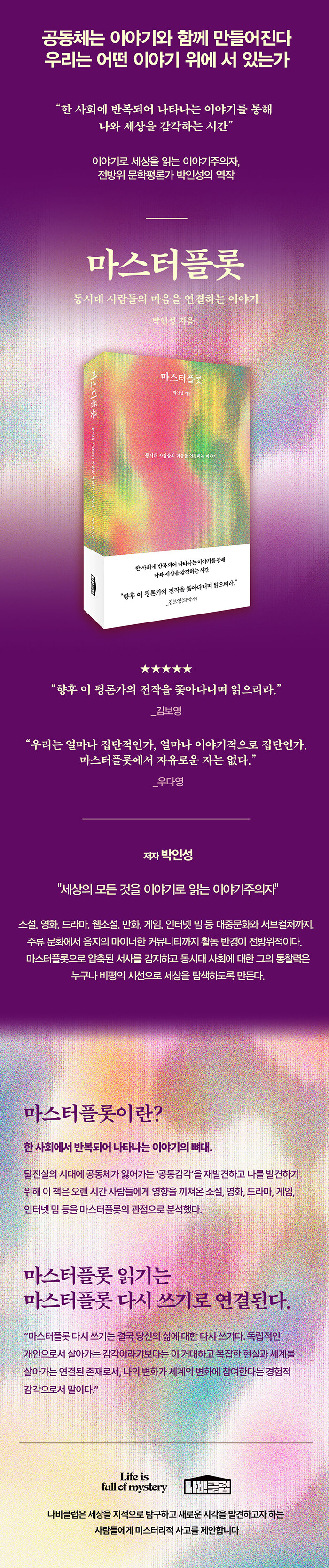 전방위 문학평론가 박인성의 역작!《오이디푸스 왕》, 《햄릿》부터 《체인소 맨》, 《진격의 거인》, <오징어 게임>, 게임 〈심즈〉(SIMS) 등 대중문화와 서브컬처를 아우르며 이야기로 세상을 읽는 이야기주의자, 박인성 문학평론가의 신간이 출간되었다. 전작 《이것은 유해한 장르다》에서 모든 서사에 침투하는 매력적인 장르로서의 미스터리를 파헤쳤다면, 신간에서는 오랜 시간 사람들에게 영향을 끼쳐온 소설, 영화, 드라마, 게임 등의 서사 콘텐츠를 마스터플롯의 관점으로 분석한다. 마스터플롯은 한 사회에서 반복되어 나타나는 이야기의 뼈대다. 이 책이 마스터플롯에 주목하는 이유는 분명하다. 탈진실의 시대에 공동체가 잃어가는 ‘공통감각’을 재발견하기 위해서다.