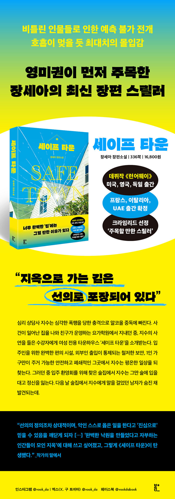 오직 다섯 채로 이루어진 세이프 타운은 안전한 피난처를 갈구해 온 지수에게 더없이 완벽한 장소다. 가장 안전해야 할 집에서 강도를 당한 그에게 안팎으로 통제되는 세이프 타운은 낙원과도 같다. 타운 사람들이 그에게 베푼 선의 뒤에 숨은 진실을 알게 되지만 지수는 동조할 수밖에 없다. 드디어 손에 넣은 안식처를 빼앗길 수 없다는 마음 외에도, 법이나 사회가 지켜주지 않았다는 그들의 분노를 지수 역시 겪었기 때문이다. 작가는 안전에 대한 불안, 피해자가 보호받지 못하는 현실을 다양한 등장인물에 투영하여 보여준다. 가해자, 피해자라는 스테레오 타입에서 벗어난 복잡하고 입체적인 인물들을 지켜보는 독자는 쉽게 악인, 선인을 구분할 수 없다. 과거의 선이 현재 악으로 재평가되는 현실 또한 낯설지 않다. 어딘가 비틀리고 다면적인 인물들로 인한 예측할 수 없는 전개와 거듭되는 반전으로 속도감을 잃지 않고 내달리는 스릴러 소설 《세이프 타운》은 페이지를 덮는 마지막까지 독자에게 큰 울림과 잊지 못할 전율을 선사할 것이다.