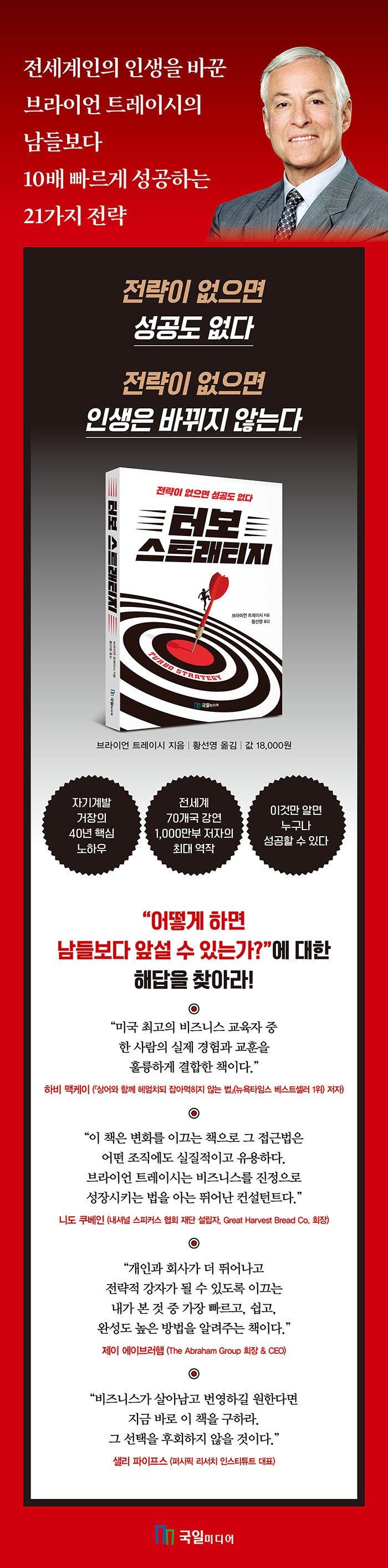 미국을 비롯한 전세계 70개국, 500개 이상의 기업과 협력하면서 40년 동안 쌓아온 풍부한 경험을 전하는 자기계발의 거장 브라이언 트레이시의 최대 역작이다. 이 책은 기업이 예측 불가능한 위기와 변화의 흐름 속에서 더 크게 도약할 수 있는 전략을 그리고 남들보다 더 빠르게 성공할 수 있는 전략을 전한다. 마케팅, 영업, 조직관리 등 핵심 영역에서 점검해야 할 21가지 전략 포인트를 통해서 누구보다 빠르게 최고의 성과를 낼 수 있는 행동 지침을 제시한다.