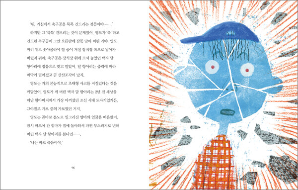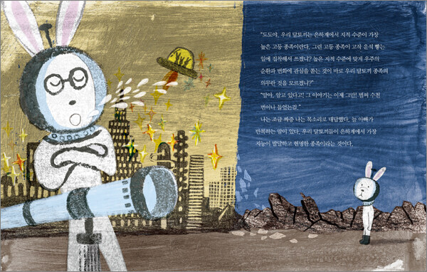 재빨리 아빠에게 달려갔다. 아빠가 내게 망원경을 건네줬다. 망원경 속에 우주복을 입고 있는 사람들이 보였다. 옷에 적힌 글씨를 보니 지구인들이 틀림없었다. 그런데 배경이 낯이 익었다. 검은 하늘과 황량한 들판……. 바, 바로 우리 달이잖아! 나는 놀란 눈으로 아빠를 바라봤다. 아빠는 씨익 미소를 지으며 고개를 끄덕거렸다.