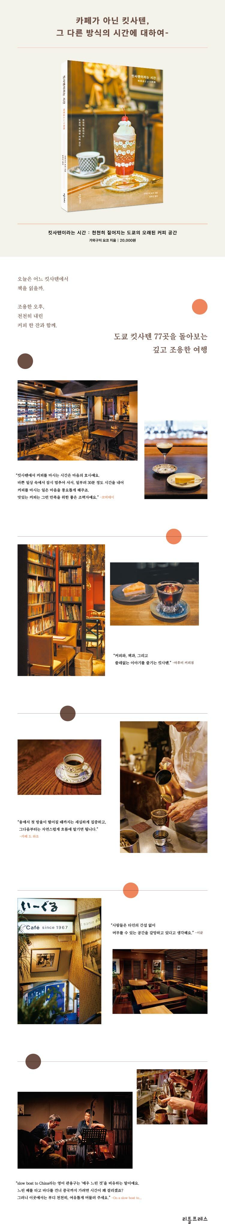 오래된 커피 공간, 킷사텐의 의미킷사텐은 단순히 커피를 마시는 곳이 아니다. 오랜 시간 같은 자리를 지키며, 주인과 단골, 그리고 우연히 들른 손님들이 각자의 속도로 머무는 공간이다. 화려한 메뉴나 빠른 회전 대신, 한 잔의 커피를 중심으로 느슨하게 이어지는 시간. 이 책은 그런 킷사텐의 풍경 속에 자연스레 스며들게 한다. 읽는 동안 독자는 어느새 그 조용한 자리 한켠에 앉아, 천천히 커피를 식히고 있는 자신을 발견하게 될 것이다.