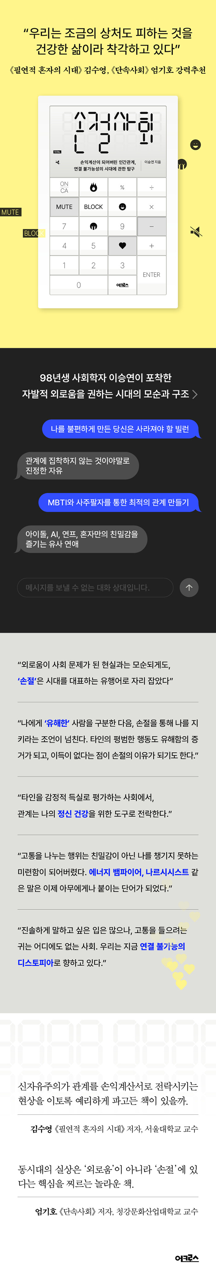 손익계산이 되어버린 인간관계, 연결 불가능성의 시대‘나르시시스트 손절법’, ‘회피형 친구 손절한 썰’ 등의 게시물이 온라인 커뮤니티에 가득하고, 유튜브와 릴스에는 심리학적·정신의학적 용어를 동원해 ‘유해한’ 사람을 구분하는 법을 알려주는 동영상이 인기를 끈다. 이렇듯 ‘손절’이라는 유행어는 인간관계를 단절하라는 조언이 넘치는 우리 시대의 풍경을 보여준다. 그런데 한편으로 외로움은 개인의 문제를 넘어 사회 문제로 확장되어, 2024년 실시된 한 설문조사에서는 19~59세 한국 성인 응답자 57%가 평소 일상생활에서 외로움을 느끼고, 89%가 외로움을 느끼는 사람들이 사회에 많다는 데 공감했을 정도이다.