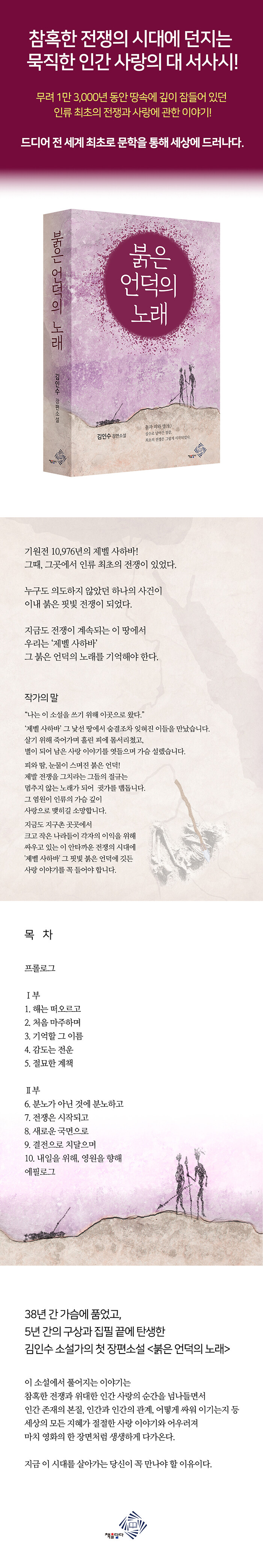김인수 작가의 첫 장편소설 <붉은 언덕의 노래> 지금으로부터 1만 3,000여 년 전, 아프리카 대륙 북부의 ‘제벨 사하바’라는 땅에서 인류 최초의 전쟁이 벌어졌습니다. 그 후로 오랫동안 감춰져 있던 참혹한 전쟁과 뜨거운 사랑의 이야기가 이제 우리 앞에 펼쳐집니다.