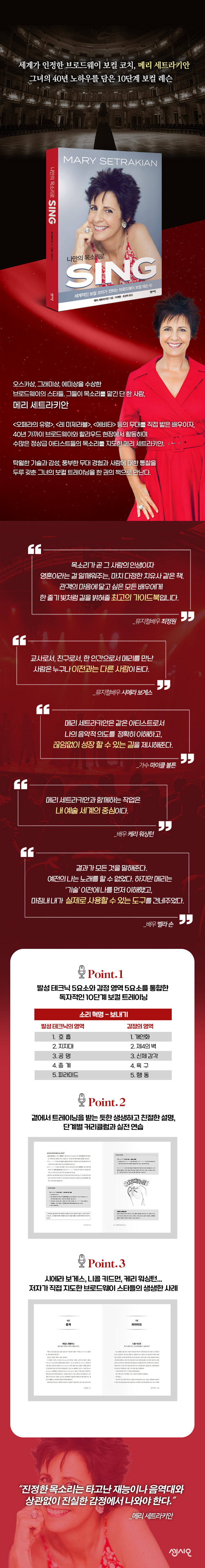우리는 완벽한 음정보다 더 중요한 것이 있다는 것을 이미 알고 있다. 오디션 프로그램에 참가한 지원자들의 노래를 듣다 보면, 정확한 음정이나 뛰어난 가창력보다도 듣는 이의 마음을 움직이는 진정성 있는 목소리에 더 크게 반응하게 된다. 그렇다면 노래에 감정에 담는다는 것은 무엇일까? 그리고 그것은 어떻게 가능한 걸까? 메리 세트라키안의 《나만의 목소리로 SING》은 바로 그 질문에 답하는 책이다.