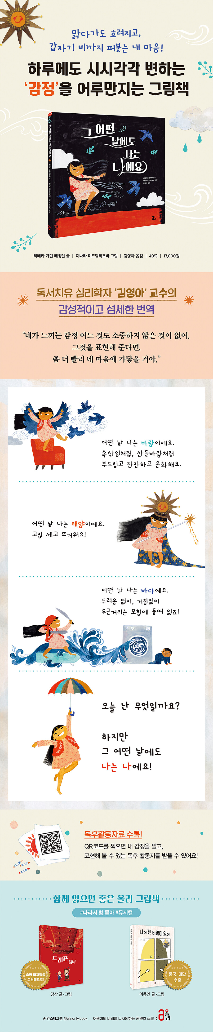 나를 ‘나’라고 말해 주는 그림책하루에도 몇 번씩 변하는 아이들의 마음을 우리는 얼마나 잘 이해하고 있을까. 《그 어떤 날에도 나는 나예요》는 이러한 감정의 변화를 바람, 태양, 구름, 비, 씨앗 등 자연의 모습에 빗대어 섬세하게 풀어낸 그림책이다. 시처럼 흐르는 문장과 강렬한 색감의 그림이 어우러져, 주인공 아이의 감정과 기분을 직관적이면서도 깊이 있게 전달한다. 작품은 감정과 기분에 따라 달라지는 ‘나’를 하나의 이름으로 고정하려는 시선에서 벗어나, 모든 감정은 자연스럽고 당연한 것이며 그 모든 날들의 모습이 모여 내가 되는 것이라는 메시지를 전한다. 아이와 어른 모두에게 전하는 다정한 위로이자, 자신의 감정을 고치거나 억누르기보다는 있는 그대로 인정하고 바라보는 것이 곧 자기 이해의 시작임을 보여 준다.
