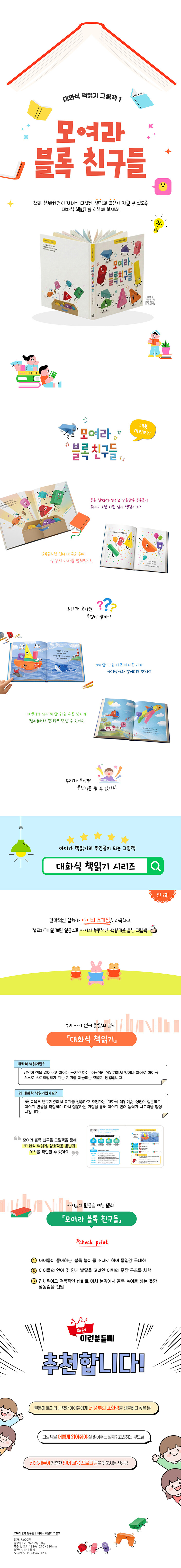 블록 놀이는 블록을 차곡차곡 쌓거나 이리저리 끼우며 새로운 것을 만들어내는 놀이로, 영아들이 특히 좋아하며 어린이집에서 매일 접하는 친근한 놀이다. 영아는 자신이 만든 블록으로 놀이하면서 자연스럽게 상상의 세계에 빠져들어 다채로운 이야기를 펼치게 된다. '모여라 블록 친구들'은 블록들이 집, 자동차, 동물, 배, 비행기로 변하며 아이들을 상상의 세계로 안내하는 그림책이다. 블록들이 모이면 무엇이 될까요? 자녀와 함께 책을 읽으며 창의적인 상상을 나누어 보자.