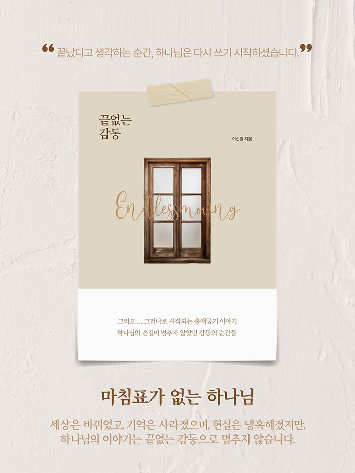 복음이 삶이 되는 친구 공동체, 아미쿠스 교회를 섬기는 목회자이다.말씀을 통해 하나님이 마음을 전하고 성경의 이야기가 오늘 우리의 삶 속에서도 계속 진행되고 있음을 나누는 말씀사역을 하고 있다.공허 같은 시간 속에서도 하나님은 마침표를 찍지 않으시고 새로운 이야기를 시작하신다고 믿는다.설교와 묵상을 통해 삶의 자리에서 역사하시는 하나님의 은혜와 감동을 전하고 있다.