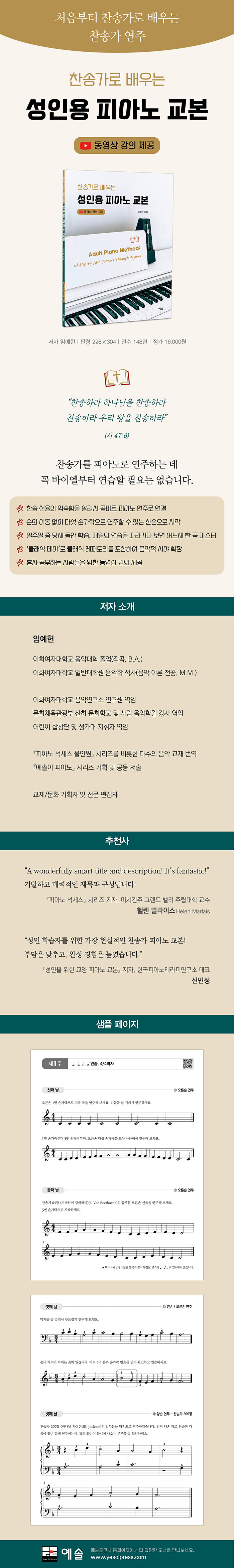 찬송가 연주라는 확고한 목표를 제시하고, 성인 학습자가 꾸준히 완성해 갈 수 있는 길을 제시하는 실용적인 교본으로서, 피아노 연주의 기쁨과 찬송의 기쁨, 두 가지를 모두 누릴 수 있게 해준다.