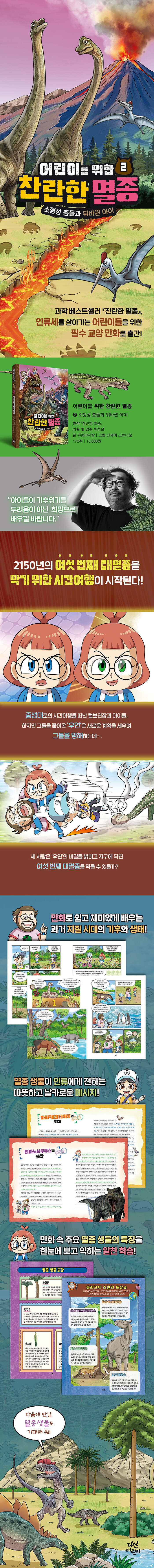 인류세를 살아가는 어린이들을 위한 필수 교양만화출간 즉시 과학 베스트셀러 1위에 오르며 독자들에게 놀랍고도 찬란한 멸종 이야기를 들려준 이정모 관장의 《찬란한 멸종》이, 환경 오염과 에너지 소비, 식생활처럼 사람의 활동이 지구 환경을 가장 크게 바꾸는 시대인 ‘인류세’를 살아가는 어린이들을 위한 필수 교양만화로 돌아왔다. 《찬란한 멸종》에서 만났던 멸종 생물들의 재치 있고 따뜻한 메시지와 멸종 돋보기, 멸종 생물 도감을 통해 배우는 생물들의 놀라운 생존 능력까지 함께 만날 수 있다.