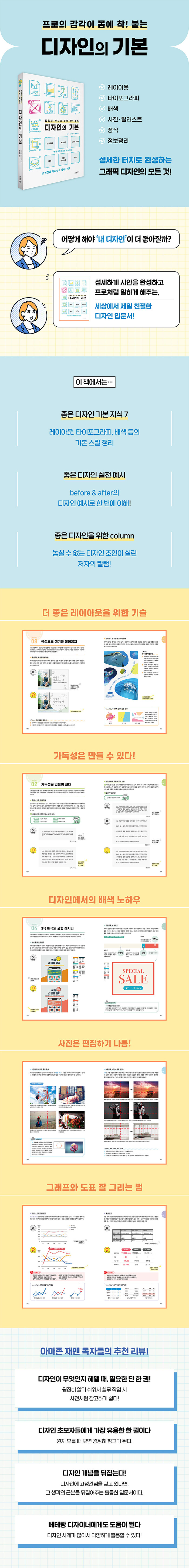 저자는 디자인에 타고난 감각이 반드시 필요한 것은 아니며, 디자인을 위한 기본과 요령 등의 지식을 익히면 프로의 감각이 몸에 체화되고, 보기 좋으면서 이해도 잘되는 디자인을 만들 수 있다고 이야기한다. 특히 이 책에는 단순히 좋은 디자인의 예시만 있는 것이 아니다. 보는 순간 좋은 디자인이 무엇인지 바로 이해할 수 있는 before & after로 알려주기 때문에, ‘내 디자인이 뭐가 문제지?’라고 고민하고 있다면 정답을 바로 찾을 수 있다.