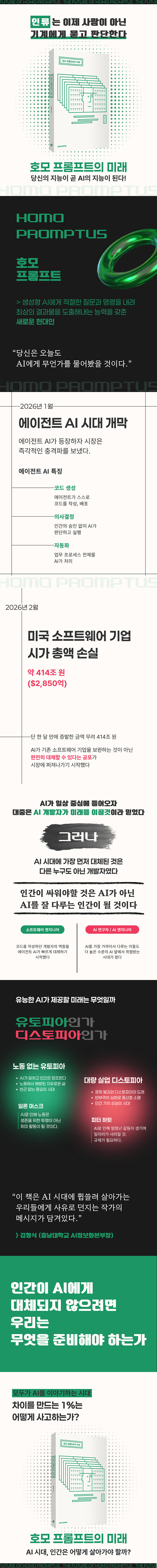 『호모 프롬프트의 미래』는 새 시대가 열리는 호모 프롬프트의 시대를 맞아 현재와 앞으로 전개될 미래에 대해 다뤘습니다. 누군가에게는 새로운 기회가 되기도 하고, 또 다른 사람에게는 위험 요소가 될 것으로 생각됩니다. 지금도 늦지 않았으니 지금부터라도 준비하고 대비해 나간다면 AI의 위험으로부터 벗어날 수 있을 것입니다.