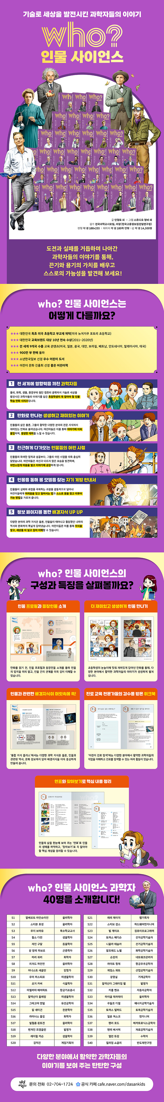 기술로 세상을 발전시킨 과학자들의 이야기!〈who? 인물 사이언스〉 시리즈는 물리, 화학, 생물, 환경부터 첨단 컴퓨터 공학까지 기술로 세상을 발전시킨 과학자들의 이야기를 담은 초등학생이 꼭 알아야 할 인물 학습 만화 시리즈입니다. 모든 위인이 어린 시절부터 대단한 사람이었던 것은 아닙니다. 〈who? 인물 사이언스〉 시리즈는 위대한 인물들의 화려한 업적과 성공보다 그들의 어린 시절을 충실히 담고 있습니다.