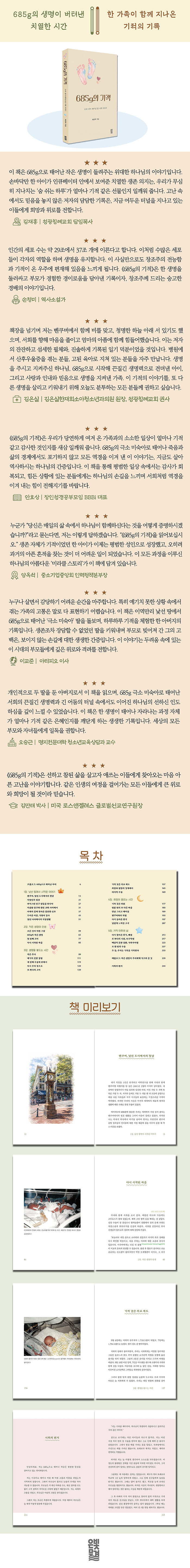 한 가족이 함께 지나온 기적의 기록《685g의 기적》은 685g의 몸으로 세상에 태어난 한 생명의 이야기이자, 그 생명을 지켜내기 위해 견뎌야 했던 가족의 시간에 대한 기록이다. 예정된 삶의 궤도를 벗어나 예기치 않은 순간과 마주했을 때, 한 가정이 어떻게 흔들리고, 또 어떻게 다시 중심을 찾아가는지를 담담하게 보여준다.
