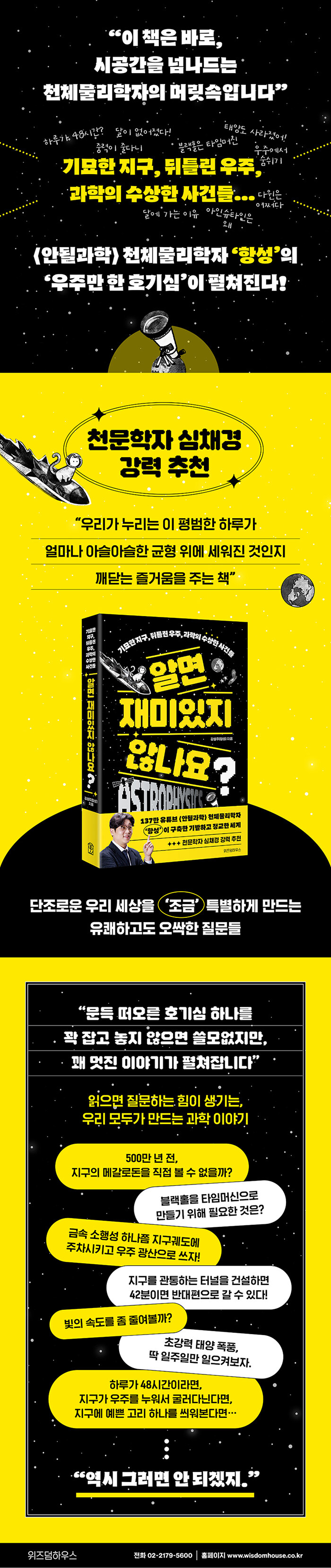 500만 년 전 지구에서 바로 이 순간의 안드로메다은하까지, 이 책은 우리의 평온한 지구 위 순간을 단번에 뒤집는 질문들로 차 있다. 개성 넘치는 호기심 하나하나를 끝까지 파고들면, 때로는 지구가 궤도를 살짝 벗어나 기후가 변하고 때로는 우주 자체가 탄생하지 않는다. 한번 생긴 궁금증을 집요하게 놓지 않는 과학자의 생각법을 따라가면 ‘알면 진짜 재미있는’ 이야기가 펼쳐질 것이다.