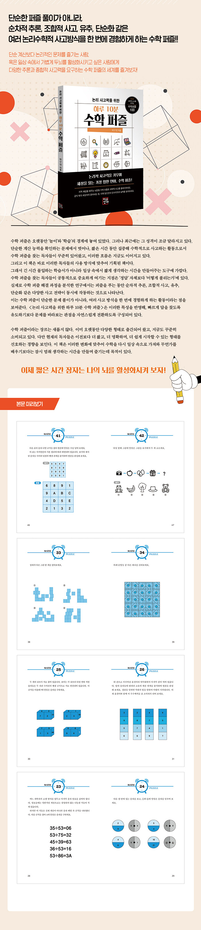 단순 계산보다 논리적인 문제를 즐기는 사람, 혹은 일상 속에서 가볍게 두뇌를 활성화시키고 싶은 사람에게 다양한 추론과 종합적 사고력을 요구하는 수학 퍼즐의 세계를 즐겨보자!