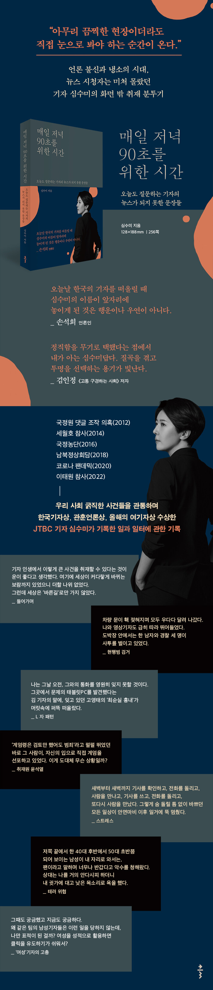 ―김인정(《고통 구경하는 사회》 저자)《매일 저녁 90초를 위한 시간》은 2016년 국정농단 사건 보도로 이름을 알린 JTBC 기자 심수미가 꺼내놓은 뉴스 뒤편의 이야기다. 조희팔 추적, 최순실 국정농단, 이태원 참사 등 우리 사회의 비극적 현장마다 발을 딛고 취재했던 그는, 90초짜리 리포트 뒤에 숨겨진 노력과 치열함을 담담하게 복기한다. 무엇보다 성공한 취재뿐 아니라 실패와 실수 등을 진솔하게 고백하며 독자에게 깊은 울림과 성찰을 안긴다. 나아가 이 책은 ‘기레기’라고 조롱받는 이 시대에도 여전히 ‘기록의 힘’을 믿는 기자의 목소리를 통해 저널리즘의 존재 가치를 증언한다.