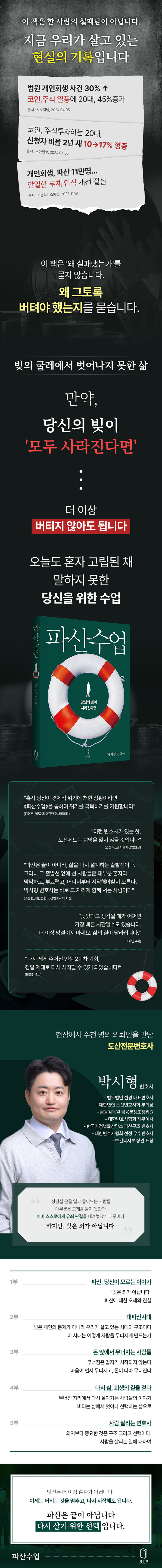 나는 가끔 변호사로서 왜 내가 이 길을 걷고 있으며, 왜 이렇게 고되고 긴 절차 속에서 끊임없는 감정노동을 감수하고 있는지 묻는다. 그럼에도 불구하고 이 일을 계속하는 이유는 나를 통해 누군가의 삶이 변화되고 다시 평범한 일상을 되찾는 모습을 보기 때문이다. 파산은 법률적 사건이지만 그 핵심은 ‘인생을 운영하는 방식’에 있다. 돈이 무너진 것은 결과다. 마음이 무너지기 시작하고, 결국 다시 살아보겠다는 의지가 모든 전환의 출발점이 된다. 이 흐름을 이해하면 파산이 아니더라도 인간이 어떠한 위기 속에서 회복할 수 있는지 그 구조가 보인다. 나는 이 책을 통해 그 구조를 보여주고자 한다. 그리고 이 책을 펼친 독자들이 타인의 실패를 통해 배우고, 타인의 회복을 통해 다시 숨을 쉬며 자신의 인생을 재설계하게 되기를 진심으로 바란다.