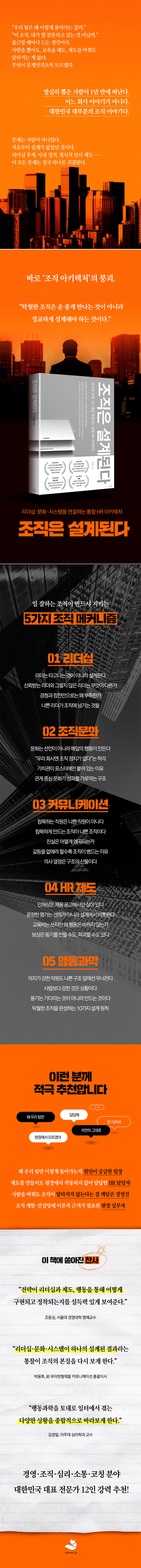 『조직은 설계된다』는 리더십부터 행동과학에 이르기까지 조직을 지탱하는 5가지 핵심 메커니즘을 해부하고, 이를 하나의 유기적인 시스템으로 통합하는 구체적인 설계도를 제시한다. 6천 권의 경영 지성과 20년 현장의 실천이 응축된 이 책은, 조직이라는 미로 속에서 방향을 잃은 모든 리더에게 단순한 조언을 넘어 지속 가능한 성장을 향한 가장 완벽한 마스터플랜이 되어줄 것이다.