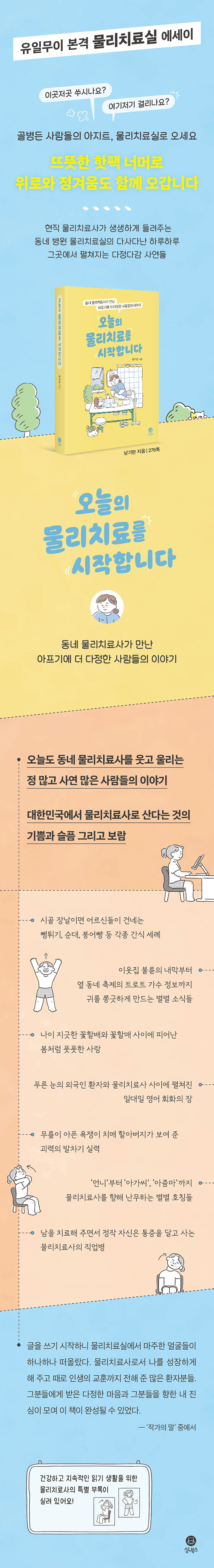 익숙한 공간임에도 지금까지 아무도 본격적으로 주목한 적 없는 물리치료실 안의 정 많고 사연 많은 일상들이 웃음과 공감, 그리고 감동을 함께 안겨 준다. 책을 읽는 중간중간에 하면 좋은 스트레칭이 특별 부록으로 실려 있다.