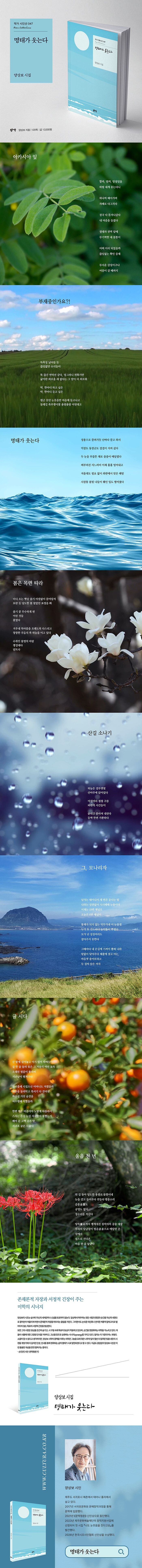 존재론적 자장과 서정적 긴장이 주는 미학의 시너지 속에서, 한국시조시인협회 신인상을 수상한 양상보 시인의 두 번째 시조집 『명태가 웃는다』가 출간되었다. 5부로 나뉘어 총 65편을 수록했으며, 『나도 눈웃음을 친다고요』에 이어 작가 기획시선 47번으로 선보인다. 제주 서귀포에서 태어나 문학청춘 신인상으로 등단한 시인의 이력도 함께 담겼다.