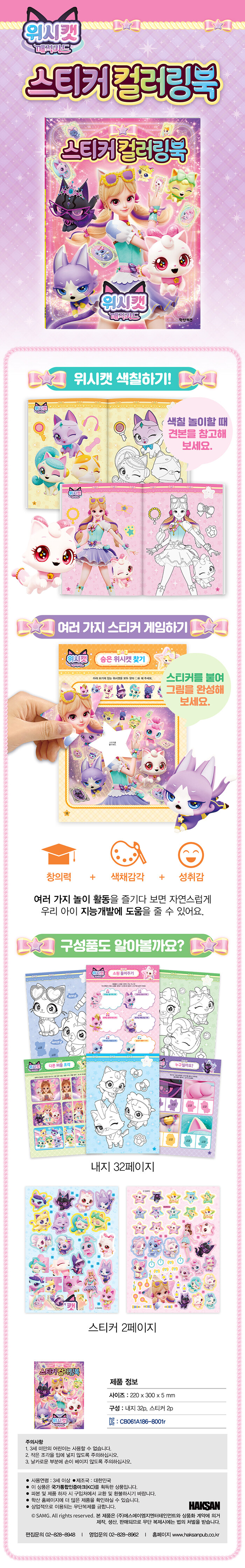 함께 들어있는 스티커 2장으로 단순히 색칠만 하는 것이 아니라 아이들이 좋아하는 스티커놀이도 함께 할 수 있어 복합적인 사고력과 응용력을 키울 수 있다. 페이지마다 좋아하는 캐릭터를 칠하면서 소근육 활동이 늘어나 집중력과 창의력이 발달되며 손과 눈의 협응력 또한 길러주어 자연스럽게 형태와 색채의 감각을 익힐 수 있다. 자신만의 개성 있는 색칠을 통한 놀이활동은 독창성도 길러 준다.