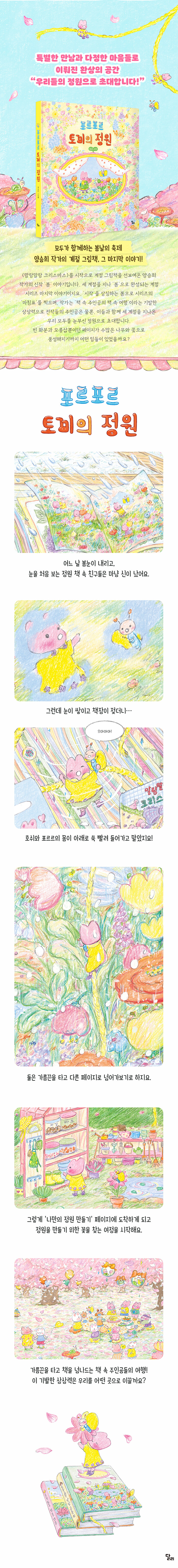 <말랑말랑 크리스마스>를 시작으로 계절 그림책을 선보여온 양승희 작가의 신작 ‘봄’ 이야기다. 세 계절을 지나 ‘봄’으로 완성되는 계절 시리즈 마지막 이야기다. ‘시작’을 상징하는 봄으로 시리즈의 ‘마침표’를 찍으며, 작가는 ‘책 속 주인공의 책 속 여행’이라는 기발한 상상력으로 전작들의 주인공은 물론, 이들과 함께 세 계절을 지나온 우리 모두를 눈부신 정원으로 초대한다.