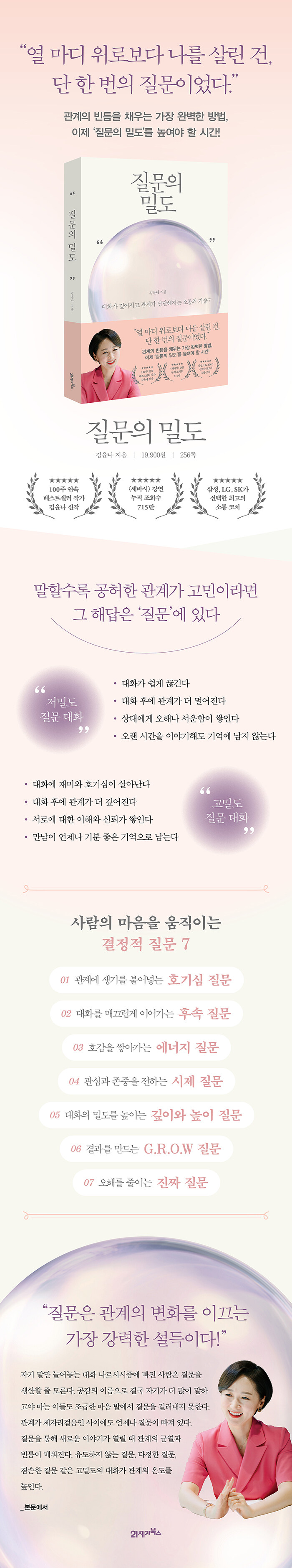 말과 마음의 연결과 회복을 삶의 프로젝트로 삼고 있는 말마음 연구소(Communication & Mind Lab)의 소장. 한양대학교 교육대학원(인재개발 전공)을 마치고 광운대학교 산업심리학과 박사과정(코칭심리 전공)을 수료했다.2010년부터 현재까지 다양한 기업과 매체에서 마음을 돌아보고 말을 변화시키는 것에 관한 강연을 해오고 있으며, 말마음 연구소를 통한 보다 깊이 있는 일대일 코칭 과정도 진행하고 있다. 상담과 강연에서 쌓았던 코칭 경험을 <말 그릇> 시리즈에 녹여내 큰 반향을 일으켰다. 지은 책으로는 《말 그릇》, 《말의 시나리오》, 《서른이 지나도 아직 나를 모른다》, 《내 말은 왜 오해를 부를까》, 《김윤나의 마음 그릇: 매일 나를 채우는 연습》 등이 있다.어떤 대화는 하고 나면 더 외로워진다. 용기 내어 속마음을 꺼냈지만, 돌아오는 것은 상투적인 위로와 ‘대화의 유턴’뿐이다. 소통전문가 김윤나는 이 공허함의 뿌리를 질문의 실종에서 찾는다. 관계가 멀어지는 것은 말주변이 부족해서가 아니라, 상대의 본심에 가닿는 질문의 ‘밀도’가 낮기 때문이다. 이 책은 공감, 설득, 위로가 필요한 결정적 순간에 멈춰버린 대화를 되살리는 7가지 질문의 기술을 담고 있다. 좋은 질문은 상대를 향하기 전에 질문자 자신을 먼저 변화시킨다. 스스로를 먼저 들여다볼 줄 아는 사람만이 비로소 타인과 가장 깊이 연결되는 대화를 완성할 수 있다.말마음 연구소 cmindlab.com인스타그램 @yunnacoach블로그 blog.naver.com/enself유튜브 김윤나TV
