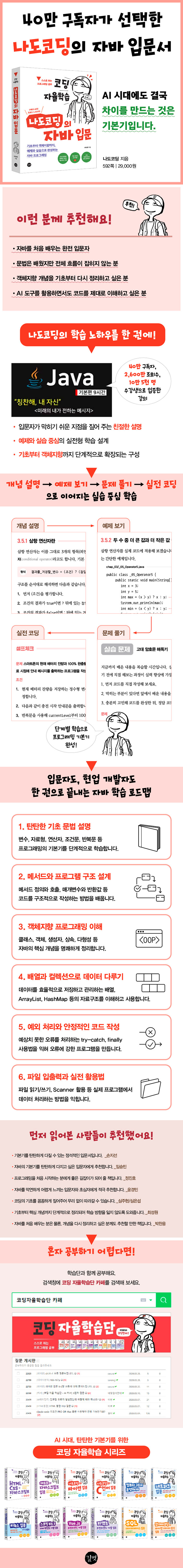 누구나 쉽고 재미있게 코딩을 공부할 수 있도록 다양한 강의를 제공하는 유튜버이자 개발자다. 유튜브 강의를 통해 개발자로 취업에 성공하거나 업무 성과를 인정받아 승진했다는 등의 감사 인사를 받을 때 가장 큰 보람과 희열을 느낀다. '예제를 통한 쉬운 설명', '군더더기 없는 깔끔한 강의'라는 수강평을 받은 이후로 이 두 가지는 반드시 지키자는 다짐으로 새로운 강의 제작에 임하고 있다. 유튜브 https://www.youtube.com/@nadocoding 인프런 https://www.inflearn.com/users/@nadocoding 유데미 https://www.udemy.com/user/nadokoding 블로그 https://nadocoding.tistory.com