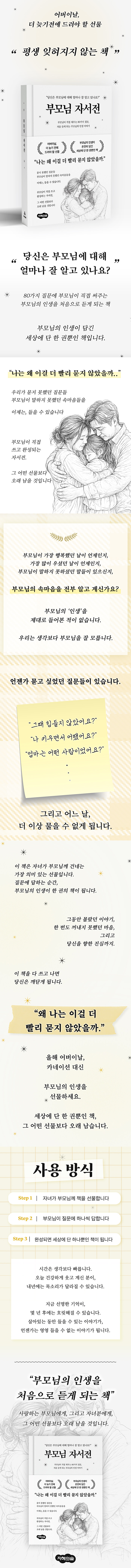 이 책은 선물하는 순간보다 선물한 뒤의 순간이 더 값지고, 선물 받는 사람뿐 아니라 선물하는 사람에게도 큰 의미가 있다. 지금 묻지 않으면 영영 들을 수 없는 이야기가 있다. 『부모님 자서전』은 부모님께 드리는 가장 다정한 선물이자, 시간이 흘러도 사라지지 않을 우리 가족만의 기록이다.