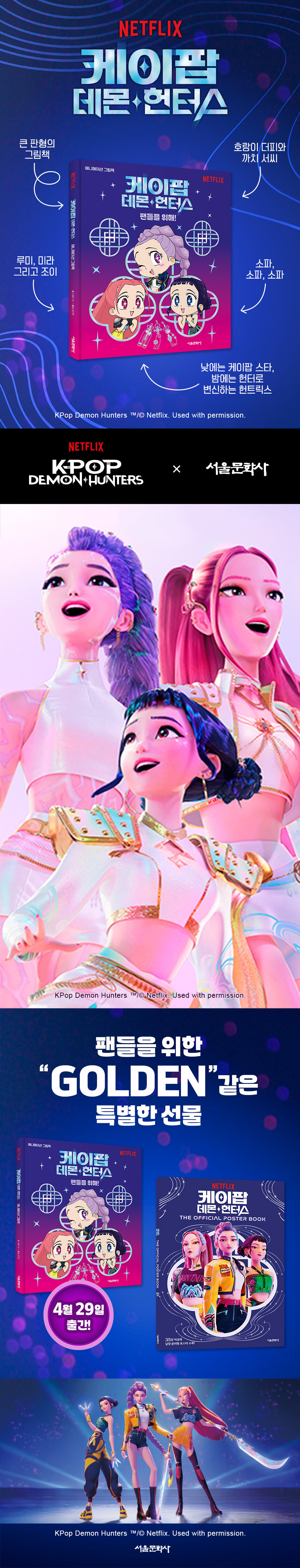*<케이팝 데몬 헌터스 애니메이션 그림책 : 팬들을 위해!>• 낮에는 케이팝 스타, 밤에는 악귀 잡는 헌터로 변신하는 주인공들이 노래, 우정, 용기를 통해
