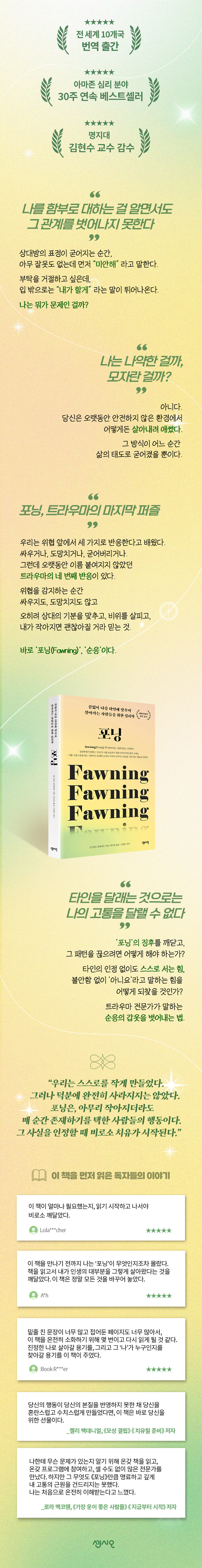 《포닝(Fawning)》은 트라우마의 마지막 퍼즐, ‘순응'에 관한 책이다. 우리는 위협 앞에서 세 가지로 반응한다고 배웠다. 싸우거나, 도망치거나, 굳어버리거나. 그런데 오랫동안 이름 붙여지지 않았던 트라우마의 네 번째 반응이 있다. 위협을 감지하는 순간 싸우지도 도망치지도 않고, 오히려 상대의 기분을 맞추고, 비위를 살피는 것. 바로 '포닝', 즉 '순응'이다.