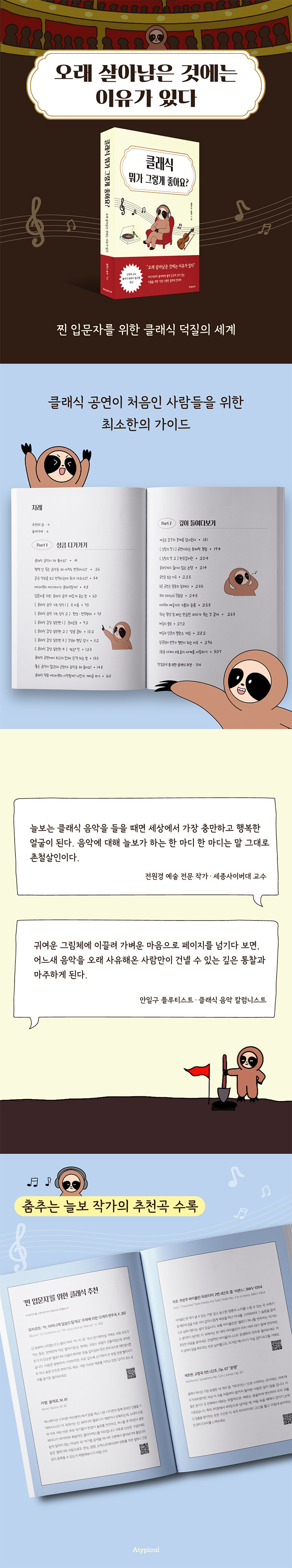 이러한 클래식 입문자들의 갈증을 해소하기 위한 《클래식 뭐가 그렇게 좋아요》가 출간되었다. 클래식툰으로 클래식 음악 ‘덕질’의 세계를 공유해온 ‘춤추는 늘보’ 작가는 이 책에서 “공연 중 박수는 왜 마음대로 치면 안 되는지”, “같은 악보를 연주하는데 연주자마다 왜 소리가 다른지” 등 문턱 앞에서 망설이는 이들이라면 누구나 한 번쯤 품었을 법한 질문들을 작가 특유의 재치 있는 만화와 글로 풀어냈다.
