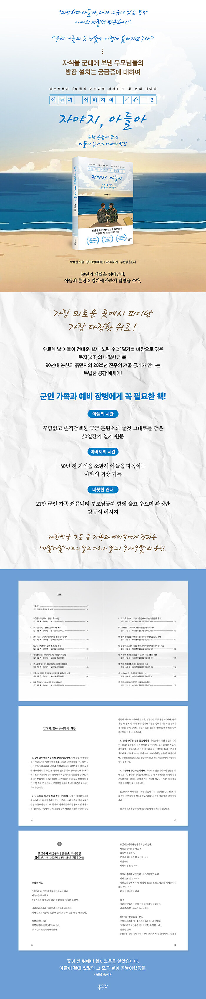 전작 《아들과 아버지의 시간》으로 많은 독자의 가슴을 울리며 뜨거운 공감을 불러일으킨 베스트셀러 작가. SBS 8시 뉴스, PBS 라디오, 동아일보 등 주요 매체가 주목한 그의 글은 온·오프라인 강연과 칼럼을 통해 수많은 이들에게 삶의 통찰을 전하고 있다.《아들과 아버지의 시간 2 : 자야지, 아들아》는 전작의 감동을 잇는 후속작이자, 군대라는 낯선 시간 속에 던져진 아들과 그 곁을 지키는 아버지가 나눈 32일간의 내밀한 기록이다. 아들의 노란 수첩에 적힌 훈련소 일기에 아버지가 30년의 세월을 거슬러 답장을 보내는 형식으로 구성되었다.저자는 이 책을 통해 군대라는 높은 담장을 넘고 있는 이 시대의 모든 아들과, 그들을 가슴 졸이며 기다리는 부모들에게 따뜻한 위로와 응원을 전하고자 한다. 저서로는 《아들과 아버지의 시간》, 《부부의 품격》, 《다산의 마지막 편지》, 《스무 살의 너에게》가 있다.