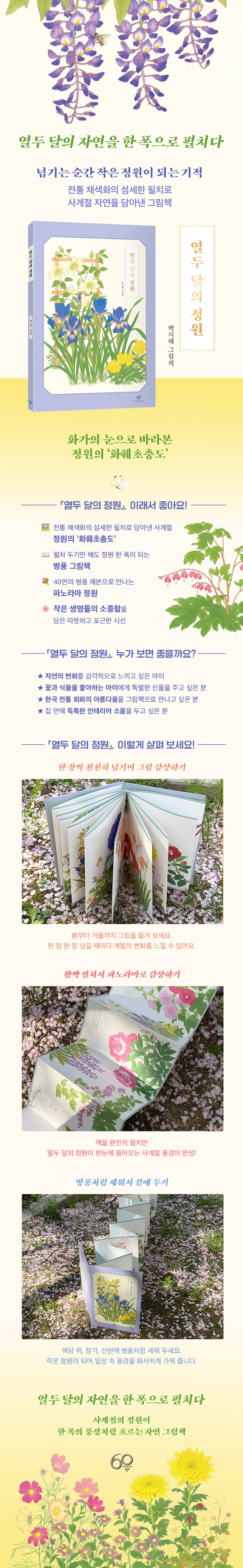 『열두 달의 정원』은 병풍 구조의 책으로 제본되어, 한 장씩 넘겨 보는 재미와 길게 펼쳐 하나의 화폭으로 감상하는 즐거움을 동시에 선사한다. 봄에서 다시 봄으로 이어지는 열두 달의 시간이 한눈에 펼쳐지기에 독자는 계절을 천천히 따라가거나 한 번에 조망하며 입체적인 독서 경험을 할 수 있다. 아울러 그림 뒷면에는 정원에 핀 꽃과 찾아온 곤충의 정보를 함께 담아 감상의 폭을 넓혔다. 책 속에서 만난 생명들을 일상에서 다시 마주할 때, 『열두 달의 정원』은 자연을 새롭게 발견하는 기쁨으로 이어지는 다정한 안내서가 되어 줄 것이다.