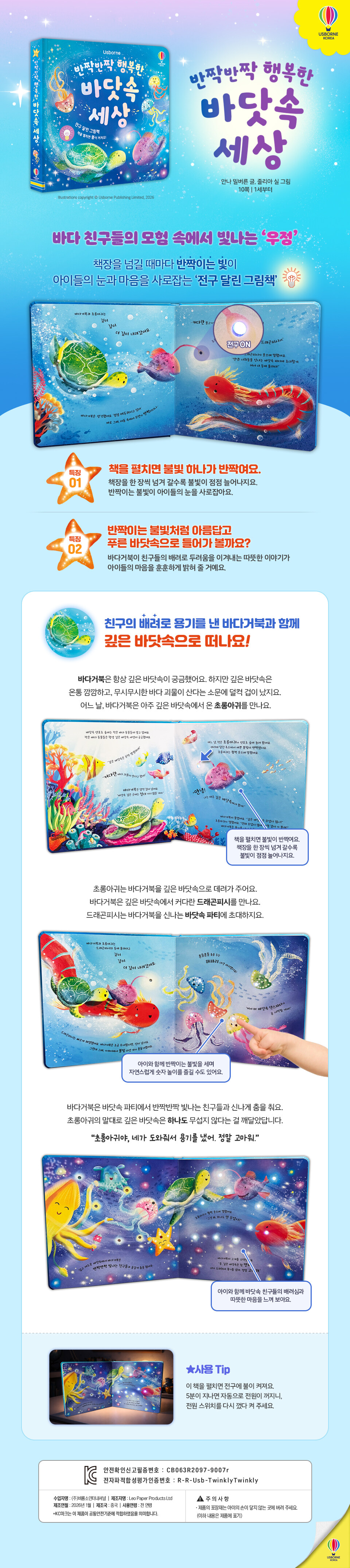 ◆ 불빛 하나, 불빛 셋, 불빛 다섯… 마음을 밝히는 따스한 그림책책장을 한 장씩 넘기면 반짝이는 불빛이 하나둘 늘어나요. 머리에서 빛이 나는 초롱아귀와 드래곤피시, 빛을 반짝이며 흔들흔들 춤을 추는 해파리, 바닷속에 뜬 별처럼 빛을 반짝이는 불가사리까지 다양한 바다 동물들을 만날 수 있지요. 또 아이와 함께 점점 늘어나는 빛을 세어보며 숫자 놀이를 즐길 수 있어요. 친구를 배려하는 바닷속 동물 친구들의 따뜻한 마음은 책을 보는 아이들의 마음도 훈훈하고 따스하게 밝혀 준답니다. 아이들은 이야기 속에 몰입하여 배려와 우정, 용기에 관해 생각해 보게 될 거예요.