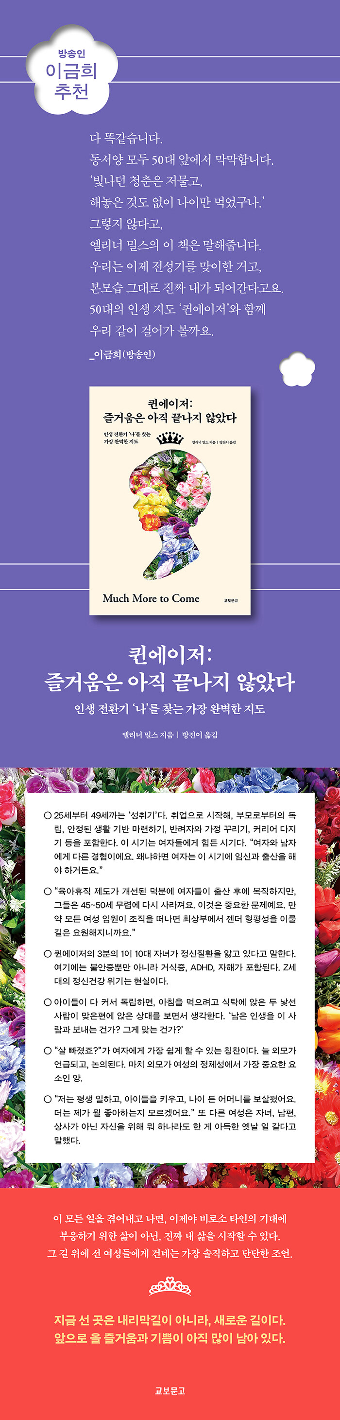 그 모든 역할에 최선을 다해 살아온 시간, 그다음에 무엇이 오는가?여자에게 투표권이 없고, 재산을 물려주지 않으며, 은행 계좌도 만들어주지 않던 시절은 그리 먼 과거의 일이 아니다. 결혼하거나 아이를 낳으면 다시 직장으로 돌아가지 못하던 것도 바로 얼마 전의 이야기다. 정년까지 일한 최초의 여성 세대가 탄생했다. 1세대 퀸에이저는 막 정년퇴직한 여성들이다. 퀸에이저들은 가정을 돌보고 나이 든 부모를 모시고 아이를 양육하며, 직장에서도 남들과 동등하게 일하려 애쓰는 삶을 살아왔다. 그러다 보니 어느 날, 아이는 독립하고 자의든 타의든 일을 그만두게 된다. 그때가 되면 ‘나는 누구이며 앞으로 어떻게 살아가야 하나’ 문득 막막해질 때가 있다. 비슷한 시기에 질병 발생률은 높아지고 갱년기까지 찾아오면서 육체적 위기를 겪기도 한다.