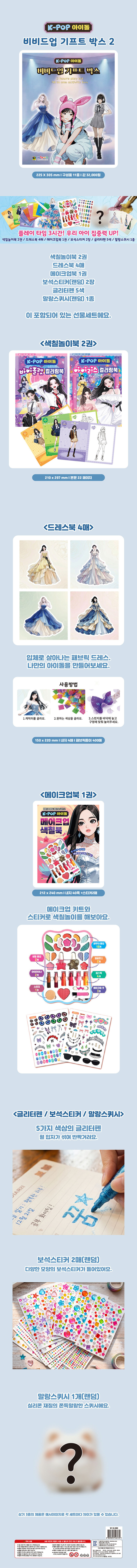 K-POP 아이돌 비비드업 기프트 박스 2는 기존 세트의 핵심 구성에 더욱 풍성한 콘텐츠를 더해, 한층 깊이 있는 창작 놀이 경험을 제공하는 프리미엄 패키지다. 색칠놀이북 2권, 드레스북 4매, 메이크업북 1권, 보석 스티커 2장, 글리터 펜 5색, 말랑 스퀴시 1종으로 구성되어 다양한 액티비티를 하나로 결합해 오랜 시간 지루함 없이 즐길 수 있다.