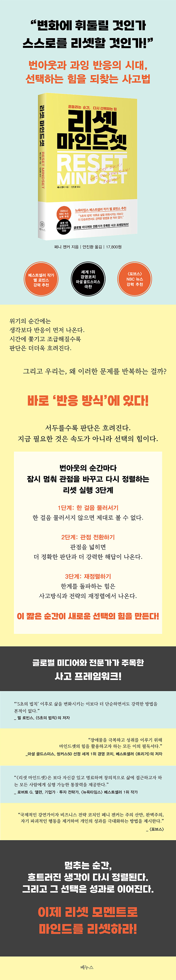 리셋의 반복이 사고를 바꾼다 | 멈추고, 보고, 다시 정렬하라 | 리셋으로 만들어 가는 성장 | 돌아갈 수는 없다 | ‘왜’에서 ‘무엇’으로, 그리고 ‘어떻게’로 | 질문을 바꾸면 의미가 달라진다 | 질문을 반복할수록 새로운 길이 열린다 | 줄다리기를 멈춰라 | 우리는 느끼는 존재다 | 복잡한 상황은 단순하게 | 관점 전환이 만든 성과 | 집중력을 장악하라 | 리셋 모멘트와 실행의 세 단계 | 리셋 마인드셋의 가치 | 변화에 대해 다르게 생각하기 | 시간을 최대한 효과적으로 활용하기 | 고착 상태에서 벗어나기 | 목표에 더 빠르게 도달하기 | 올바른 사안에 집중하기 | 리셋 연습