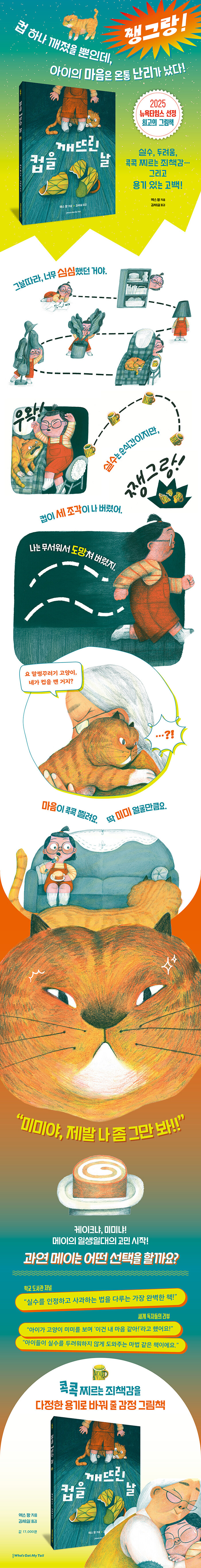 지금 가장 눈여겨봐야 할 작가, 엑스 팡의 작품《컵을 깨뜨린 날》은 2025년 뉴욕타임스 선정 '최고의 그림책'에 이름을 올리며 작품성과 화제성을 함께 인정받았습니다. 엑스 팡은 아이의 감정을 유머러스하고 섬세하게 그려 내는 작가입니다. 영화처럼 리듬감 있게 흐르는 화면, 조마조마한데 자꾸 웃음이 나는 장면들, 끝내 뭉클해지는 마무리까지. 실수를 두려워하기보다 정직하게 마주하며 마음의 근육을 키울 수 있도록 돕는, 아이와 양육자 모두를 위한 그림책입니다.