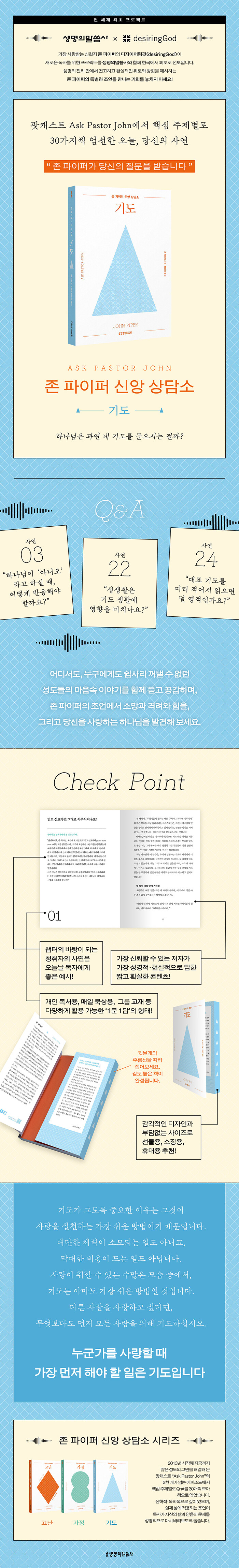 “누군가를 사랑할 때 가장 먼저 해야 할 일은 기도입니다”기도를 어려워하는 분이 많습니다. 무슨 말을 해야 할지, 어떻게, 언제, 어디서 기도하는 게 좋을지 기도를 고민하는 그리스도인은 당신만이 아닙니다. 지금 여기, 기도 생활 가운데 솔직한 고민과 심정을 토로하는 사람들의 30가지 사연이 도착했습니다. 존 파이퍼는 우리가 겪는 기도 생활에 관한 상황과 고민에 십분 공감하며 자기 삶에서 경험한 몇 가지 실질적인 기도 방법을 제안합니다.