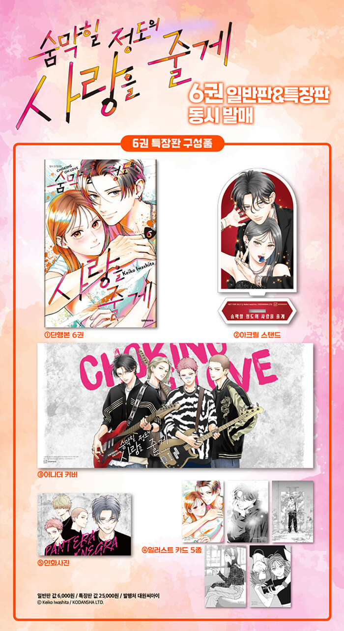 지은이 : 이와시타 케이코일본의 순정만화 작가. 《꽃을 사세요》,《거실의 마츠나가 씨》등 다수의 히트작을 보유. 현재 만화 잡지 '디저트'에서《숨막힐 정도의 사랑을 줄게》를 연재 중.