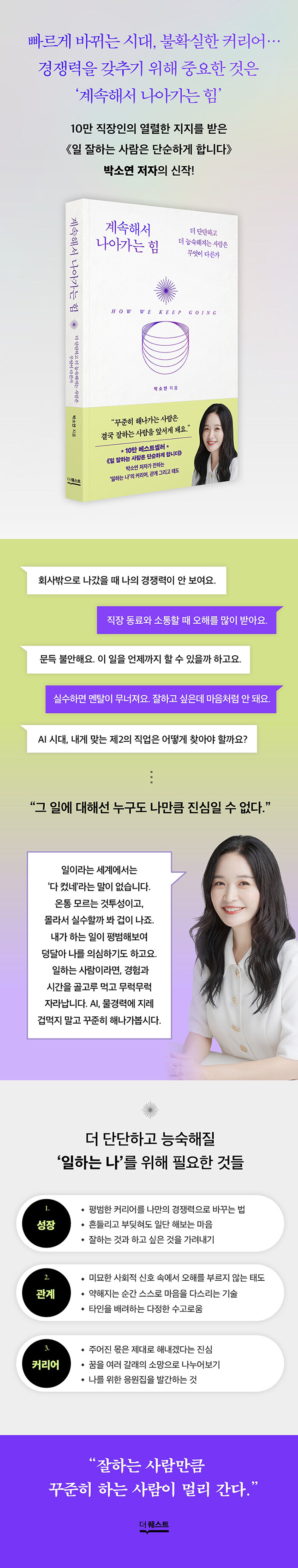 ★10만 베스트셀러 《일 잘하는 사람은 단순하게 합니다》 시리즈 박소연 저자 신작!베스트셀러 《일 잘하는 사람은 단순하게 합니다》 시리즈로 수많은 직장인의 지지를 받아온 박소연 저자가 신작 《계속해서 나아가는 힘》으로 돌아왔다. 그간 ‘일 잘하는 법’을 이야기해온 저자는 이번 책에서 한 걸음 더 나아가, ‘일하는 나’에게 진짜 중요한 것이 무엇인지에 대해 주목한다. 빠르게 발전하는 AI와 점점 짧아지는 직업 수명 속에서 나만의 경쟁력을 갖추기 위해 필요한 것은, 결국 꾸준히 해나가는 힘이라고 말한다.