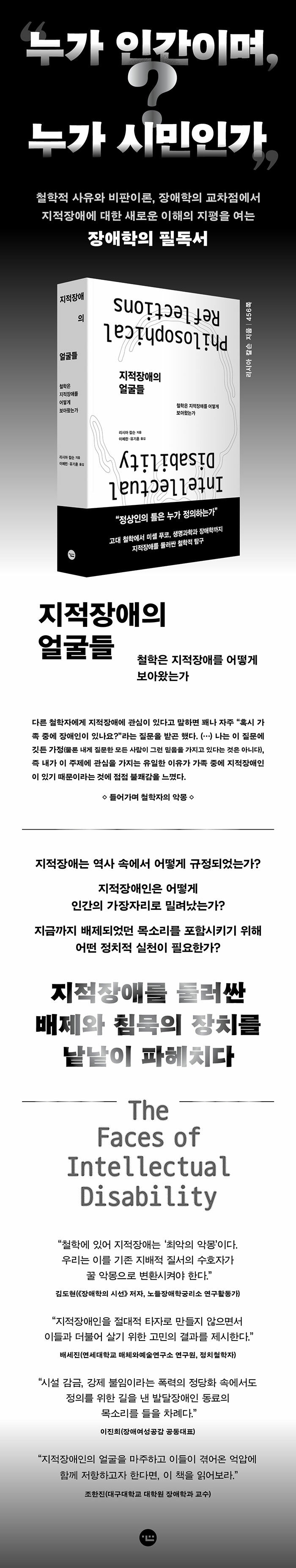 “나를 인간의 얼굴로 보라”는 발달장애인 당사자들의 외침은 발달장애인법 제정 등 제도적·법적 차원에서 많은 변화를 이끌어가고 있다. 그러나 장애인, 특히 지적장애인이 사회의 구성원으로서 환대받고 있다고 자신 있게 말하긴 어렵다. 여전히 많은 지적장애인이 자신의 삶을 결정할 자유를 빼앗긴 채로 시설에 갇혀 신체적·성적 학대에 노출되는 등 권리를 침해당하고 있다. '지적장애'는 욕설로 사용되며 우리는 일상적으로 '지능'의 높고 낮음을 운운하는 사회에서 살아간다. 비판적 학문 내부에조차 지적장애인에 대한 철학적·이론적 분석은 미비한 실정이다.