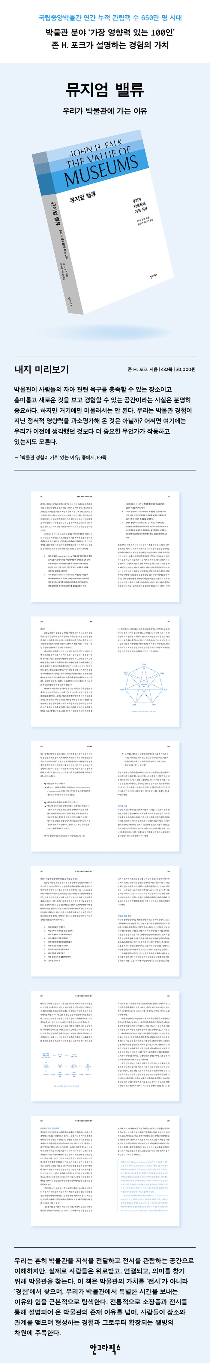 존 포크는 이 책을 통해 오랫동안 논의되었지만 충분하고 명확하게 결론이 나지 않았던 질문에 답하고자 했다. 그 질문은 바로 ‘우리가 박물관의 공공적 가치를 어떻게 이해해야 하는가’다. 이 책은 대중과 더 깊이 연결되는 경험을 통해 지속 가능하고 유의미한 미래를 설계할 수 있는 방향을 제시하며, 박물관이 어떻게 시대를 넘어 대중에게 영감을 주는 공간으로 남을 수 있는지, 그리고 무형의 가치를 어떻게 구체적으로 증명해 낼 수 있는지에 대한 정교한 로드맵을 제시한다. 지금 우리에게 필요한 것은 바로 이러한 새로운 관점이다. 박물관 종사자에게는 박물관 존재 이유에 대한 확신을, 대중에게는 자신의 경험이 얼마나 가치 있는지를 발견하게 하는 이 책은 박물관을 새롭게 바라보는 하나의 기준이 될 것이다.